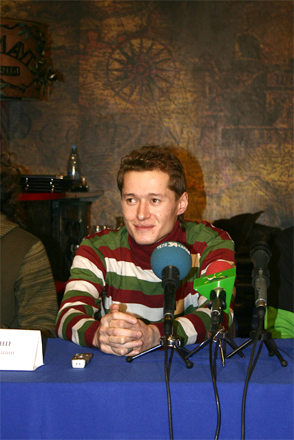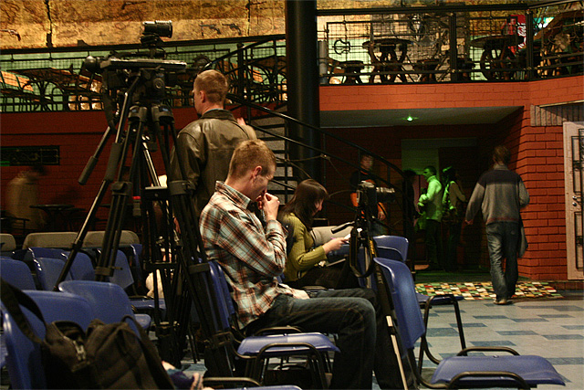 «...один директор студії 9О8 -, сидячі у залі, запитує у іншого директора студії 9О8, пана Хорсєва, який сидить за столом з усіма іншими звьоздами...»gree