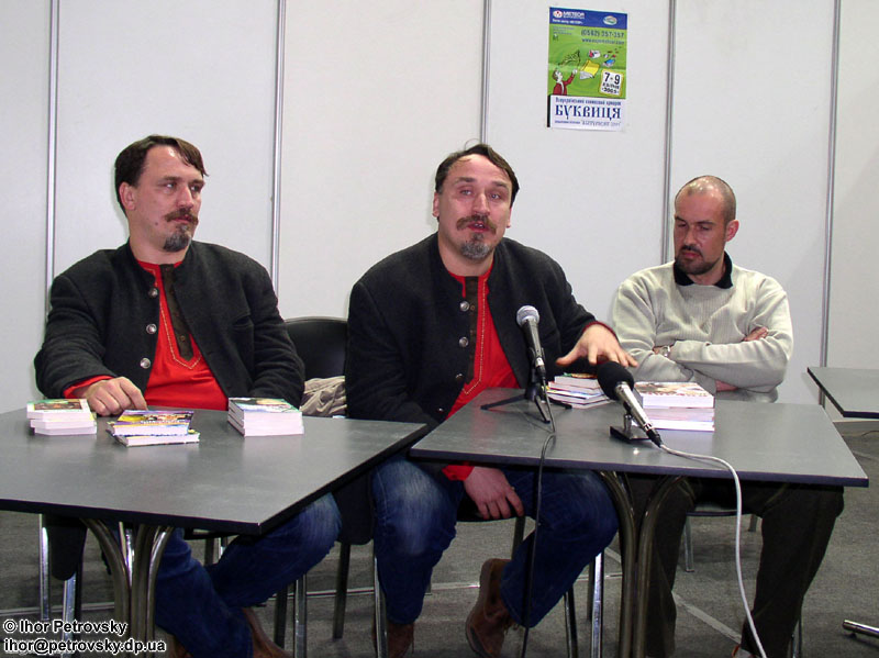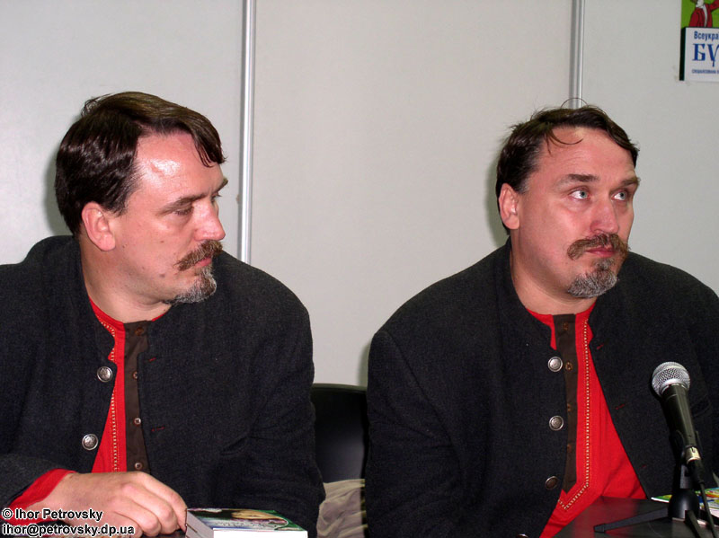Итак. Браты Капрановы — Дмитро и Виталий. Представь, себе, читатель, заматеревшего Донкихота, одетого в красну рубаху, черный френч и синие джинсы. Теперь сними с него копию и посади копию рядом. Вот это и будут браты Капрановы. Почему назвали ЗЕЛЕНИЙ ПЕС? Один из братов (отличить невозможно, ибо они как две капли) зачитал стишок, в котором говорилось, как один немец снимал барышню — спросил, есть ли у нее зелёный пёс. Та такой креативности подивилась изрядно и снялась на ура. Потом выяснилось, что у немца зелёного пса нет тоже. Такой вот психоделический стишок. Далее брат Капранов пояснил: зелёный пёс немца — то, чего нет в природе, но прикалывает барышень. ЗЕЛЕНИЙ ПЕС Капрановых — то, чего нет в Украине, но прикалывает публику. Конкретно — украинская книга, интересная, современная, не вызывающая в мозгу жуткие загробные миражи школьных уроков укрлит — украинская фантастика, украинский женский роман, украинские детские книжки, например «Енциклопедія прозивань» — справочник по обзываниям и дразнилкам. Сам хочу купить, чтобы полемизировать с руководством. Налаживать конструктивный диалог.