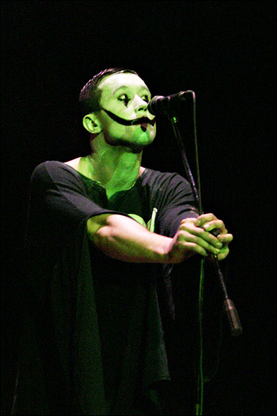 Второе отделение повеселее, да. Второе отделение — публика знает слова. Второе отделение — зонги из спектаклей и полный театр. Второе отделение — на голове роскошный цилиндр, галсух — резинка и драный фрак с вылезающей из швов ватой. Заломленный на затылок цилиндр образует черный нимб.