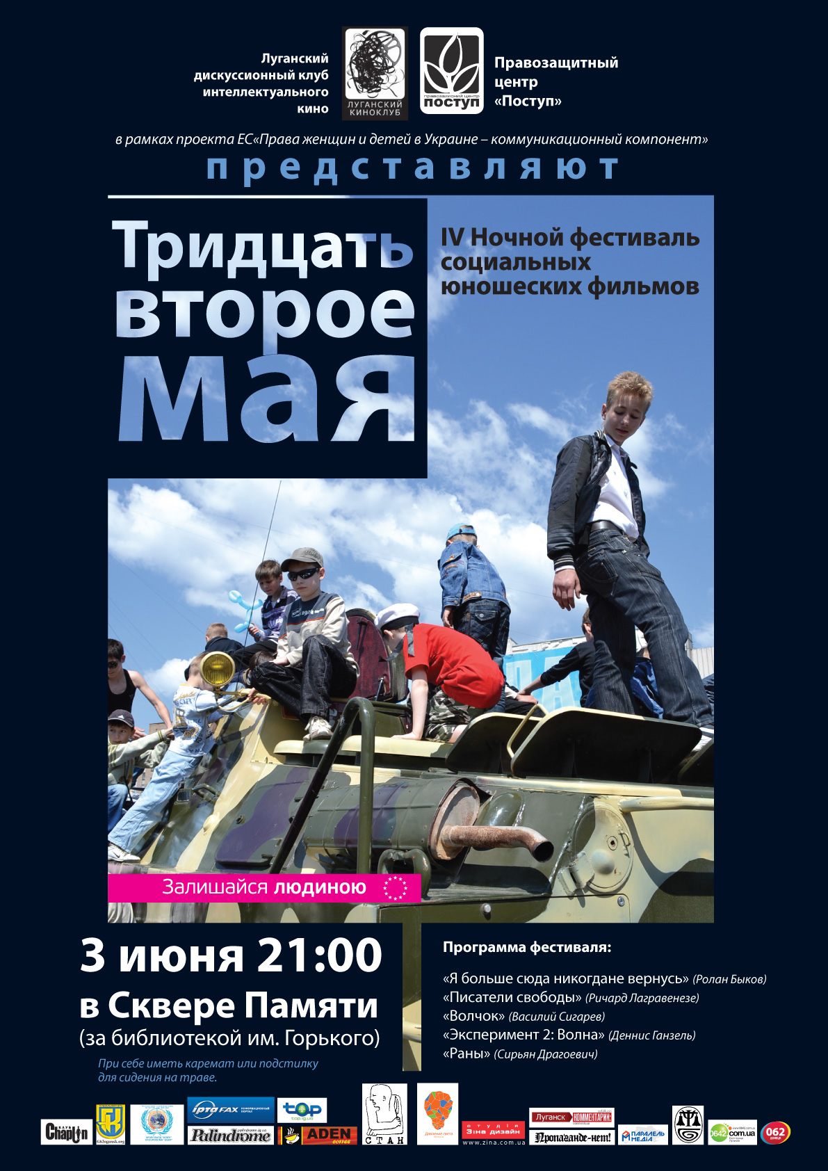 Фестиваль «Тридцять друге травня» - єдиний щорічний фестиваль кіно в Луганській області. Він традиційно привертає увагу громадськості та вважається шанувальниками некомерційного кіно «Луганським Вудстоком». Фестиваль відвідує близько 1000 осіб, які із задоволенням зустрічають літо просто неба, дискутують на актуальні соціальні питання, пов'язані із захистом прав дитини, і планують подальші дії в цьому напрямку. Під час фестивалю активісти будуть поширювати малинові браслети з написом «Залишайся людино!»