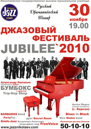 "Николаевский Джаз-Клуб" представляет III-й Джазовый Фестиваль "JUBILEE`2010", который состоится 30 ноября 2010 года в Русском Драматическом Театре.