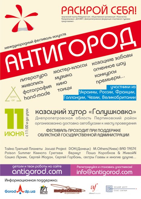 13 июня проекту Антигород исполнится 6 лет. Провожая прошлый год и начиная новый, мы решили перенести Антигород из Сети в реальный мир и проводим 11 июня большой фестиваль искусств в историческом культурном месте: на казацком хуторе Галушковка, близ Петриковки.