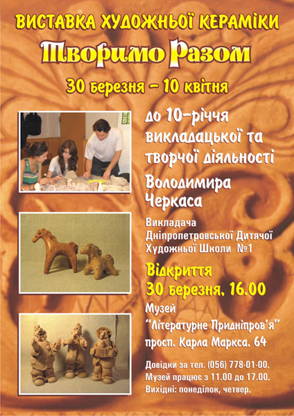 30 березня 2011 р. в 16-00 в музеї «Літературне Придніпров я» відбудеться відкриття виставки художньої кераміки «Творимо разом», присвяченої 10-річчю викладацької діяльності Володимира Черкаса, викладача Дніпропетровської дитячої художньої школи № 1.