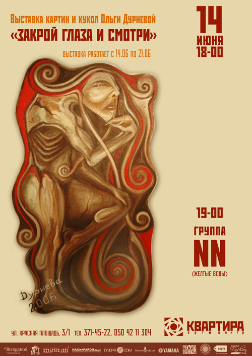 14 червня о 18.00 арт-центр "Квартира" запрошує вас на відкриття виставки сліпої художниці Ольги Дурневої "Закрий очі і дивись" (живопис і ляльки), після якої відбудеться концерт її друзів із групи NN (Жовті Води). Подібний захід, в якому об'єднаються виставка, концерт та спеціальне подання для глядачів, в арт-центрі "Квартира" проводиться вперше. Ми запрошуємо всіх прийти і підтримати Ольгу та її друзів. Музика без слів, картини і ляльки на дотик. Спробуйте хоча б на один вечір відчути життя з закритими очима, так як це робить Ольга.