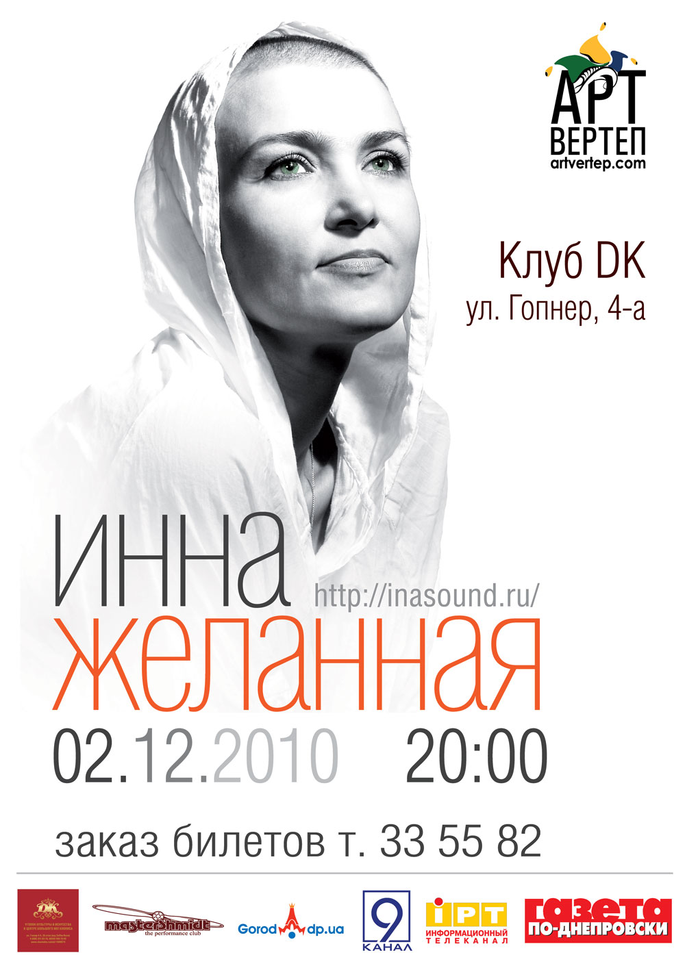 Це подія місяця (а для декого - і життя) 2 грудня 2010 року в Дніпропетровську! Хтось слухає і стежить за Інною Желанною більше 20 років, комусь пощастило відкрити для себе цю незрівнянну етно-джаз-рок Диву на торішньому Гогольфесті.