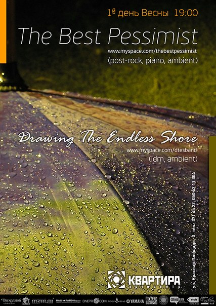 1 марта в 19:00 арт-Квартира приглашает всех на концерт групп The Best Pessimist и Drawing The Endless Shore. Вас ждет вечер незабываемых ощущений, которые можно запросто сравнить с полетом. Только причиной полета станут не психотропные вещества, а вполне легальные, созданные душой и инструментами. Пост-рок - это разрыв пространственных и временных связей, который создает атмосферу гармонии в мире хаоса.