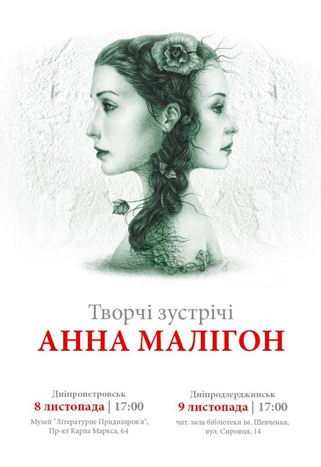 8 і 9 листопада відбудуться зустрічі з письменницею Анною Малігон у Дніпропетровську і Дніпродзержинську.