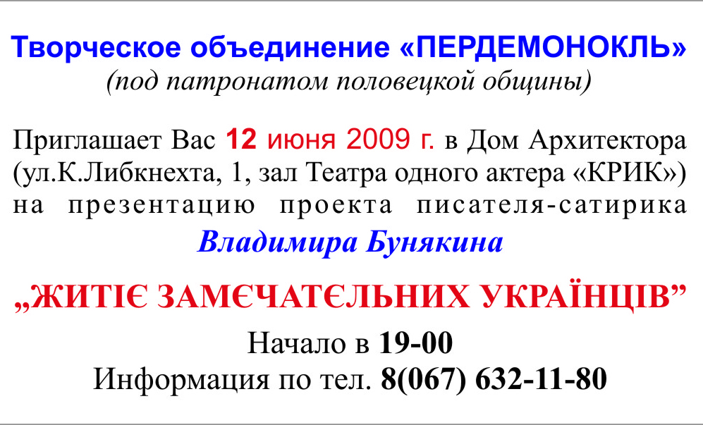 Повідомлення: Творче об'єднання "Пердемонокль" запрошує Вас на творчий вечір письменника-сатирика Володимира Бунякіна з презентацією проекта "Житіє замєчатєльних українців". Вечір відбудеться 12 червня 2009 р. о 19.00 в Будинку архітектора (залі Театру одного актора "Крик"). Інформація по тел.(067) 632-11-80.