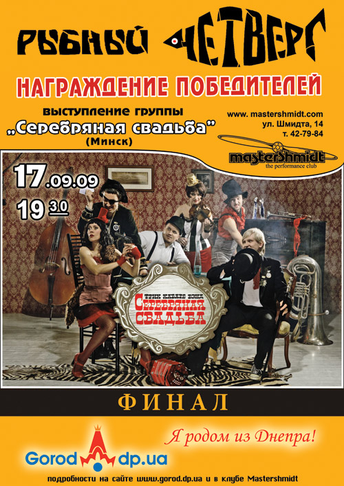 В рамках проекта с 6 августа по 10 сентября на сцене клуба Mastershmidt выступили 6 молодых и талантливых групп Днепропетровска. Победитель конкурса выступит в финальном концерте вместе с хедлайнером фестиваля фрик-кабаре-бендом "Серебряная свадьба" (г. Минск). Этот музыкально-театральный балаган образовался в 2005 году. Разбитная