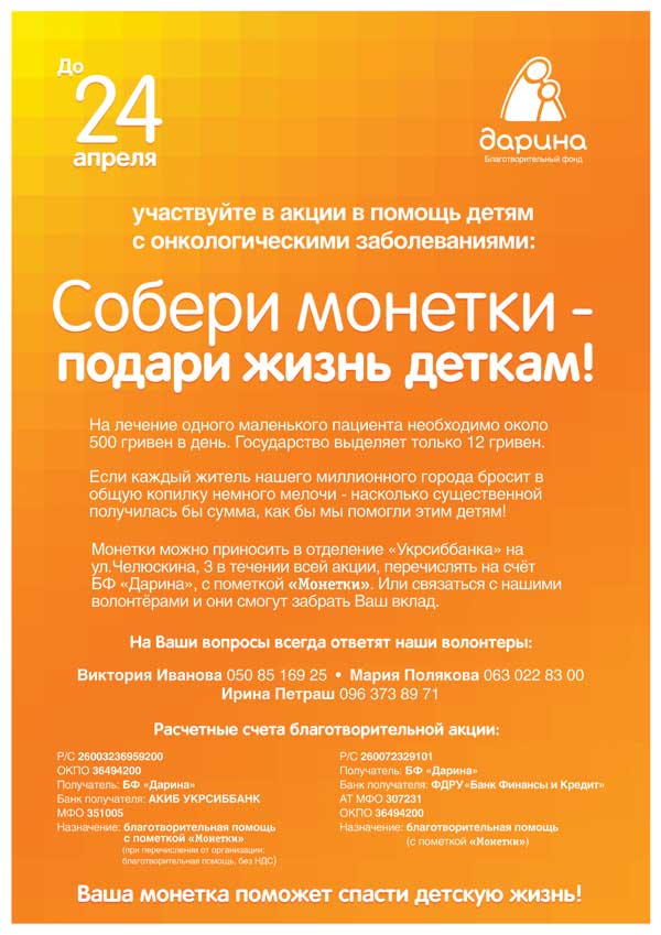 Монетки можно приносить в отделение «Укрсиббанка» на ул.Челюскина 3 в течение всей акции, перечислять на счёт БФ «Дарина», с пометкой «Монетки», либо связаться с нашими волонтёрами и они смогут забрать Ваш вклад.