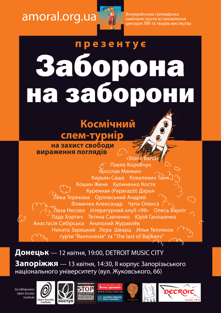 12-13 квітня, на честь 50-річчя польоту першої людини у відкритий космос, в Донецьку та Запоріжжі пройде відкритий слем-турнір на захист свободи слова та мислення.
