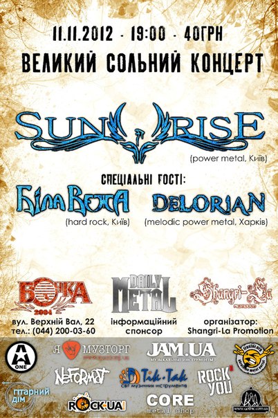 Друзья, приглашаем вас 11 ноября, в 19:00, на концерт одной из самых популярных powermetalгрупп Украины - SUNRISE!