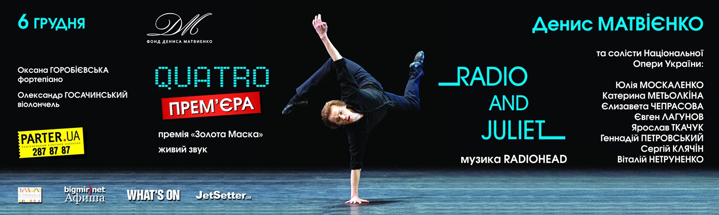 6 декабря 2012 года в 19:00 в Национальной опере Украины – «Вечер современной хореографии». Денис Матвиенко и солисты Национальной оперы Украины представят в один вечер два одноактных балета: уже полюбившийся украинским зрителям балет RadioandJuliet и премьеру – балет QUATRO!