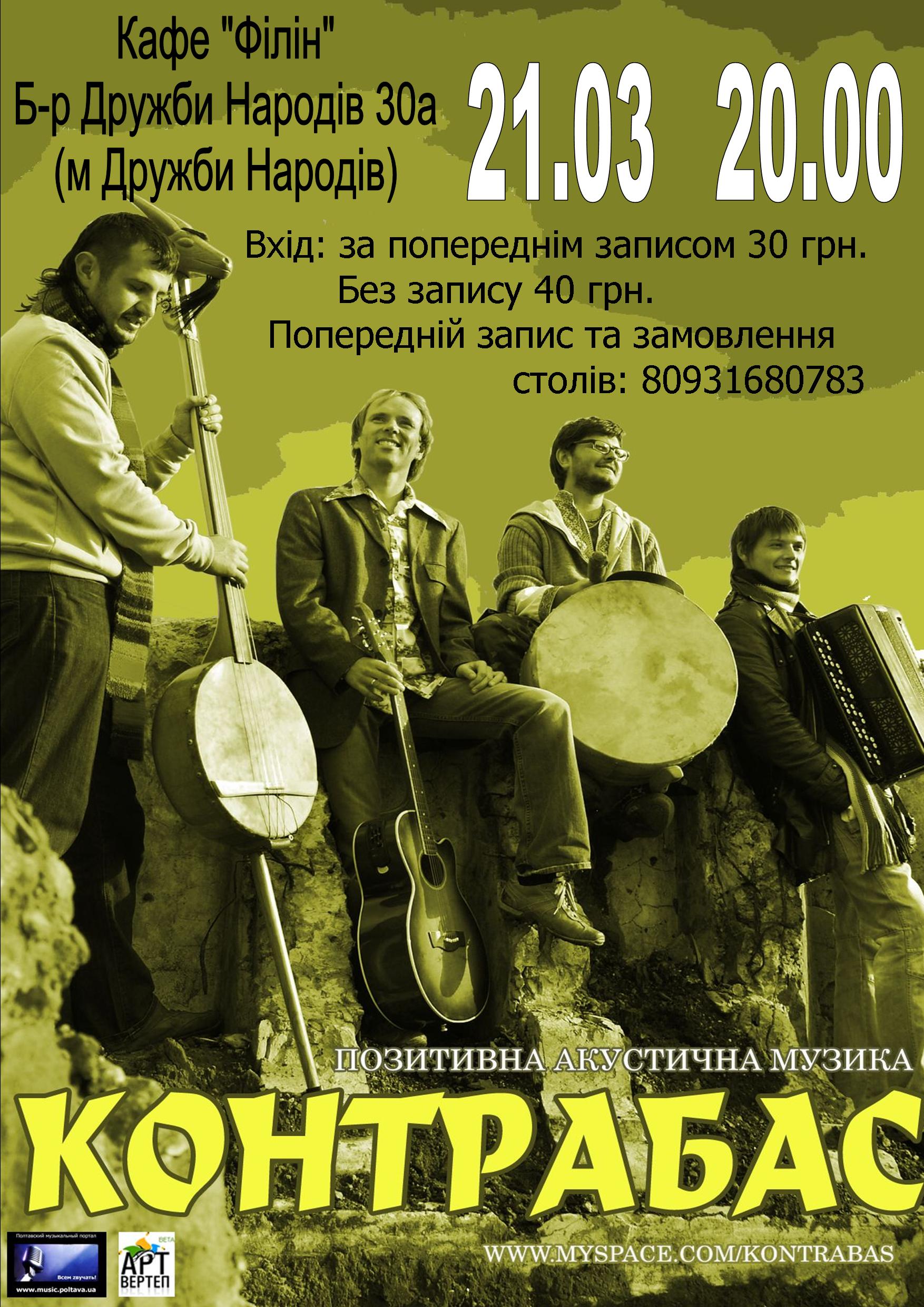 На своєму шляху додому із Вінниці акустичний квартет Контрабас потішить своїм позитивізмом і глядачів (чи-то слухачів) Києва. Дійство відбудеться 21-го березня в кафе"Філін №2", що на бульварі Дружби Народів, 30а (однойменна станція метро), в одному будинку з "Космо". Початок о 20.00. На жаль, кількість місць обмежена, тому є необхідність виражати свою готовність зазадалегідь.