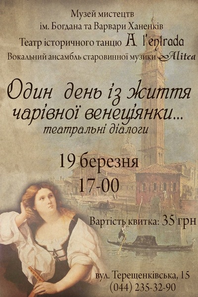19 березня о 17:00 театр історичного танцю «Al’entrada», вокальний ансамбль старовинної музики «Alitea» та музей мистецтв ім. Богдана й Варвари Ханенків запрошують у подорож до Венеції XVI ст. і представляють театральні діалоги «Один день із життя чарівної венеціянки».