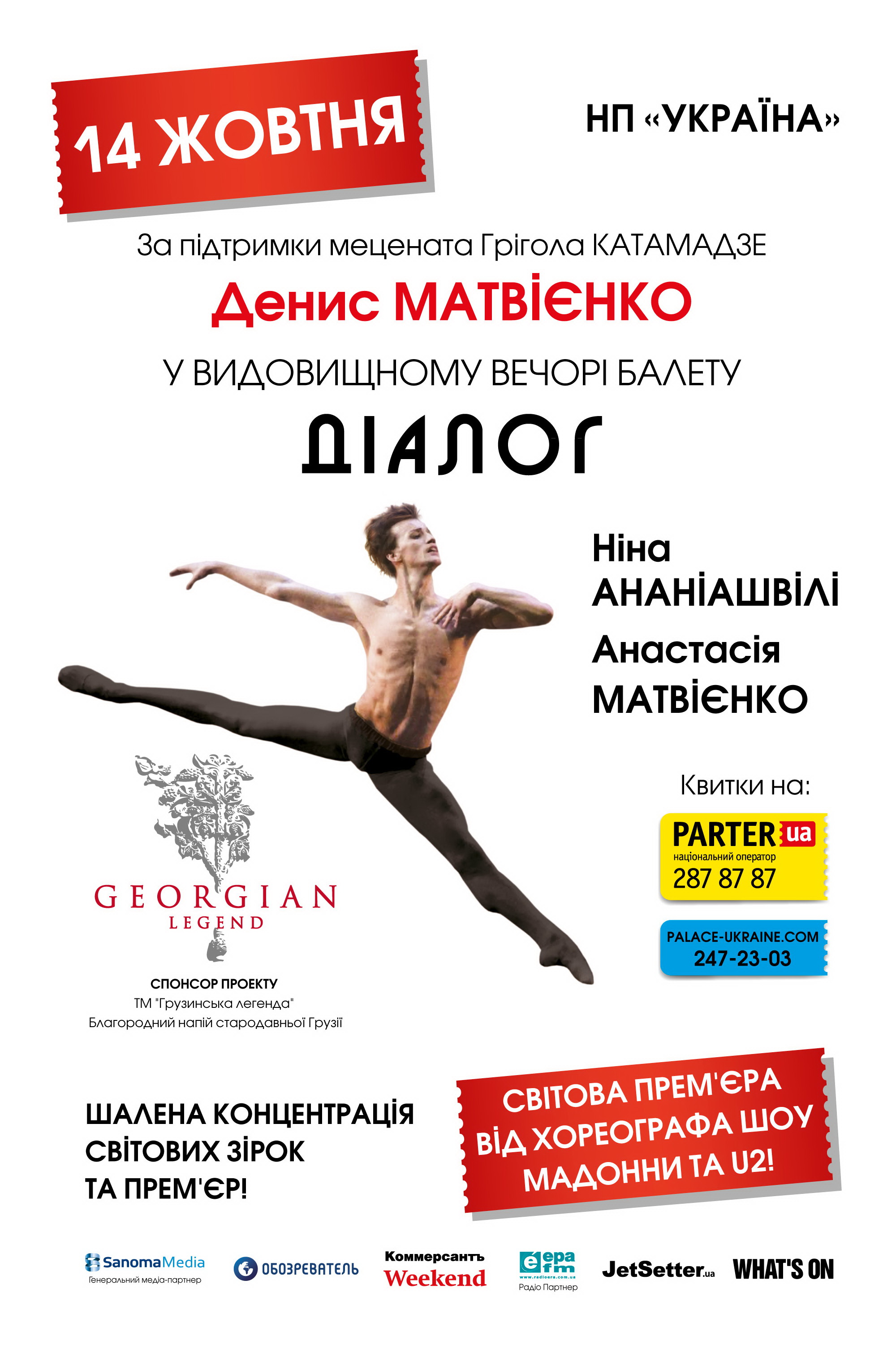 18 июня на сцене Дворца «Украина» состоится фантастический вечер балета. На сцену вместе с Денисом и Анастасией Матвиенко выйдет легендарная Нина Ананиашвили, премьер Мариинского театра Игорь Колб и солистыНациональной оперы Украины. В программе вечера - шедевры классической и современной хореографии. Впервые в Украинебудет показан фрагмент из балета «Маргарита и Арман» в исполнении Нины Ананиашвили и Дениса Матвиенко! По многочисленным просьбам зрителей программа включает в себя балет на музыку Radiohead – Radio and