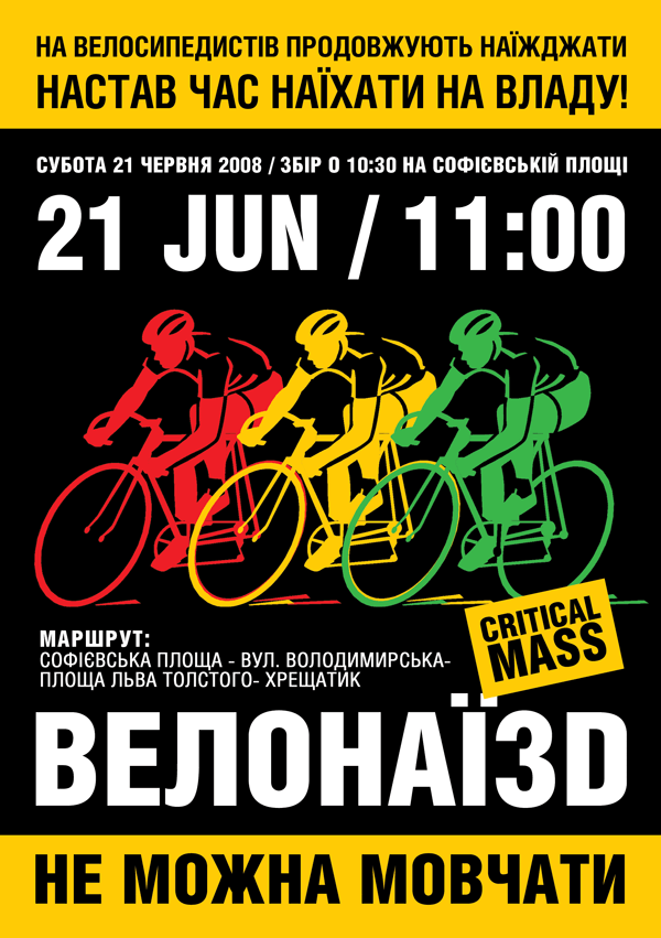 21 червня 2008 р (субота) о 10:30 на Софіївській площі відбудеться перша акція за припинення безкарності та свавілля на дорогах Києва та України. Акція має назву "Велонаїзд" та присвячена велосипедистам, які загинули та постраждали з вини автомобілістів-злочинців.