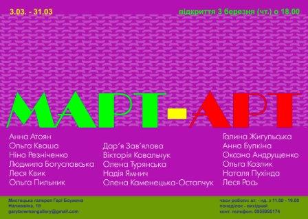 Мистецька галерея Гері Боумена запрошує на відкриття жіночої виставки “МАРТ – АРТ”, яка відбудеться 3 березня (четвер) о 18.00, в якої приймають участь: