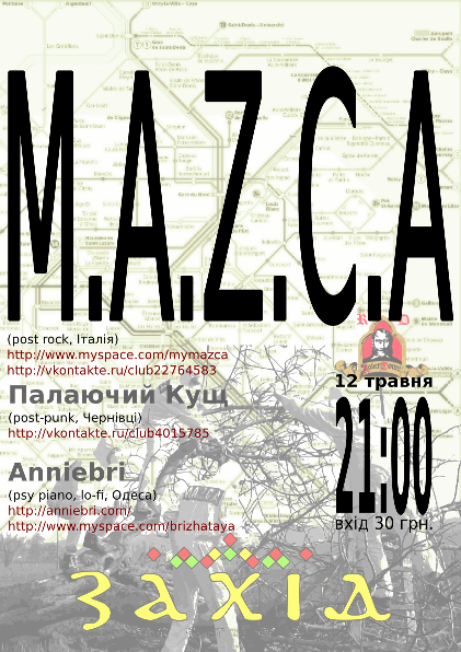 12 травня у Львові в Хмільному домі Роберта Домса-- Рух через зазвичай атипічні райони - концерт італійського пост рок гурту M.A.Z.C.A. Назва гурту- Рух через зазвичай атипічні райони, цим виражається намагання команди виразити свої емоції в музиці нестандартним підходом- про що свідчать музичні доробки команди. Свої концерти гурт любить супроводжувати різними перфомансами в поєднанні з різними видами мистецтва. Гурт має в своєму активі два повноцінні альбоми, які випустили у декількох країнах Європи. Активно гастролююча команда