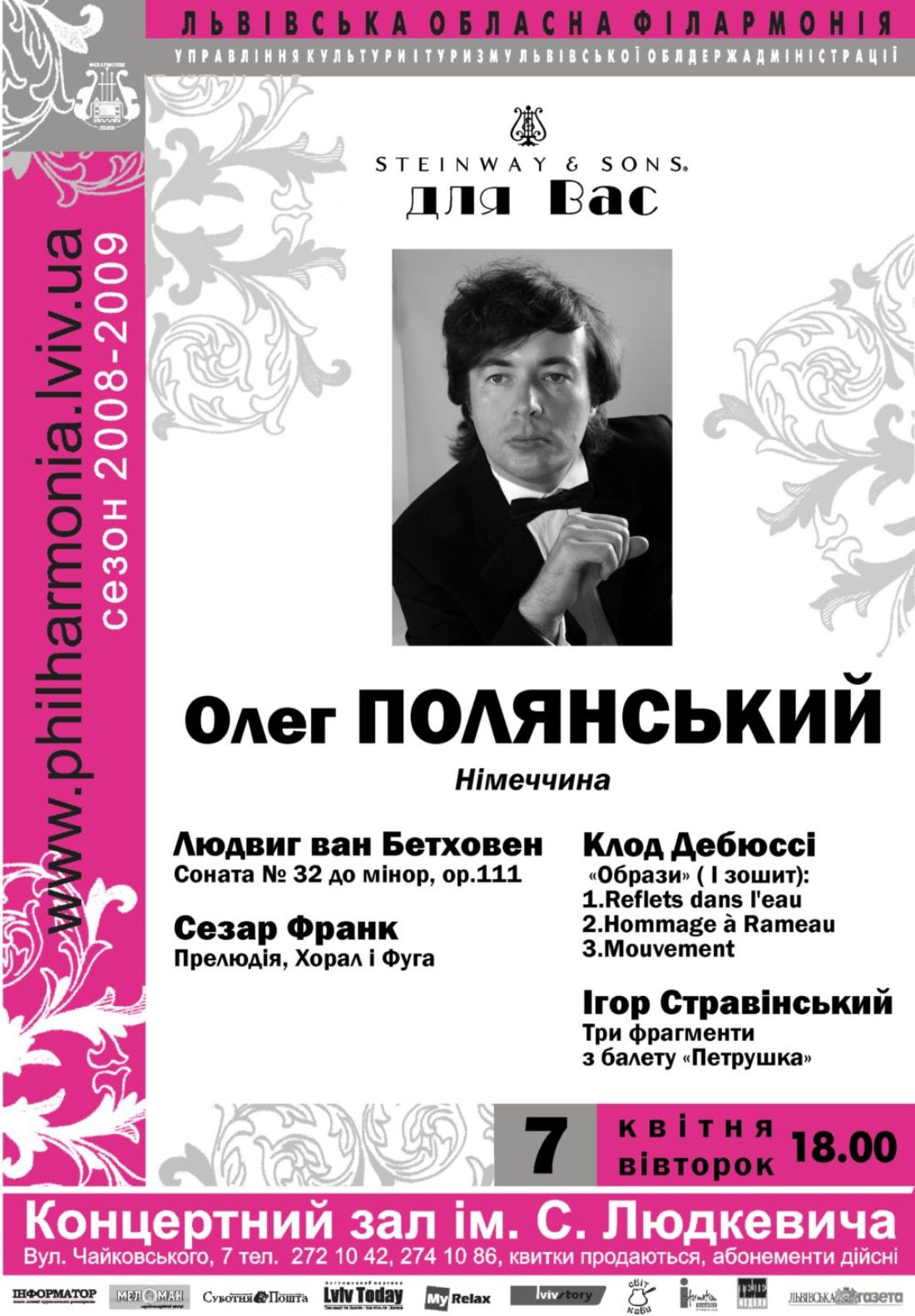 Олег Полянський – піаніст. Випускник Інституту ім. Гнєсіних (кл. проф. О. Александрова). Закінчив аспірантуру в Московській консерваторії в класі С. Доренського та Вищу школу музики в Кьольні (клас проф. П.Гилилова).