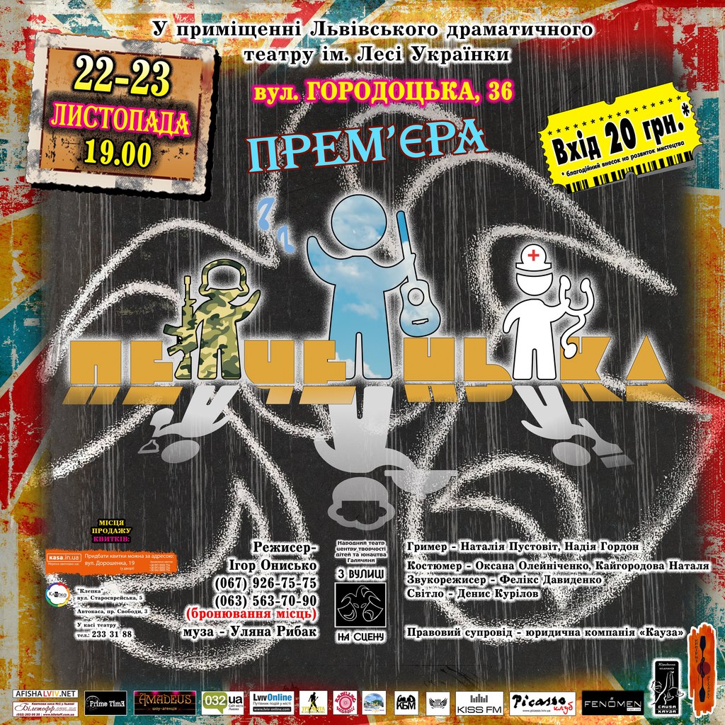 Народний драматичний театр “З вулиці на сцену”, що працює у Центрі творчості дітей та юнацтва Галичини, 22-23 листопада презентуватиме нову виставу “Печенька” на завжди актуальну і важливу тему - про здібності людей, про те, до чого у них лежить душа і, на жаль, як вони це ігнорують і займаються тим, що нав'язано зі сторони та навколишнім обставинами. Режисером і актором вистави є Ігор Онисько, а також такі актори: Сергій Шарга, Вадим Штирьов, Іра Якубовська, Марко Погуляєвський, Юрій Стогул, Юрій Скочіпець, Соломія Вуйцик. Світло – Денис Курилов, звукорежисер – Фелікс Давиденко, костюмери - Оксана Олейніченко, Наталя Кайгородова.