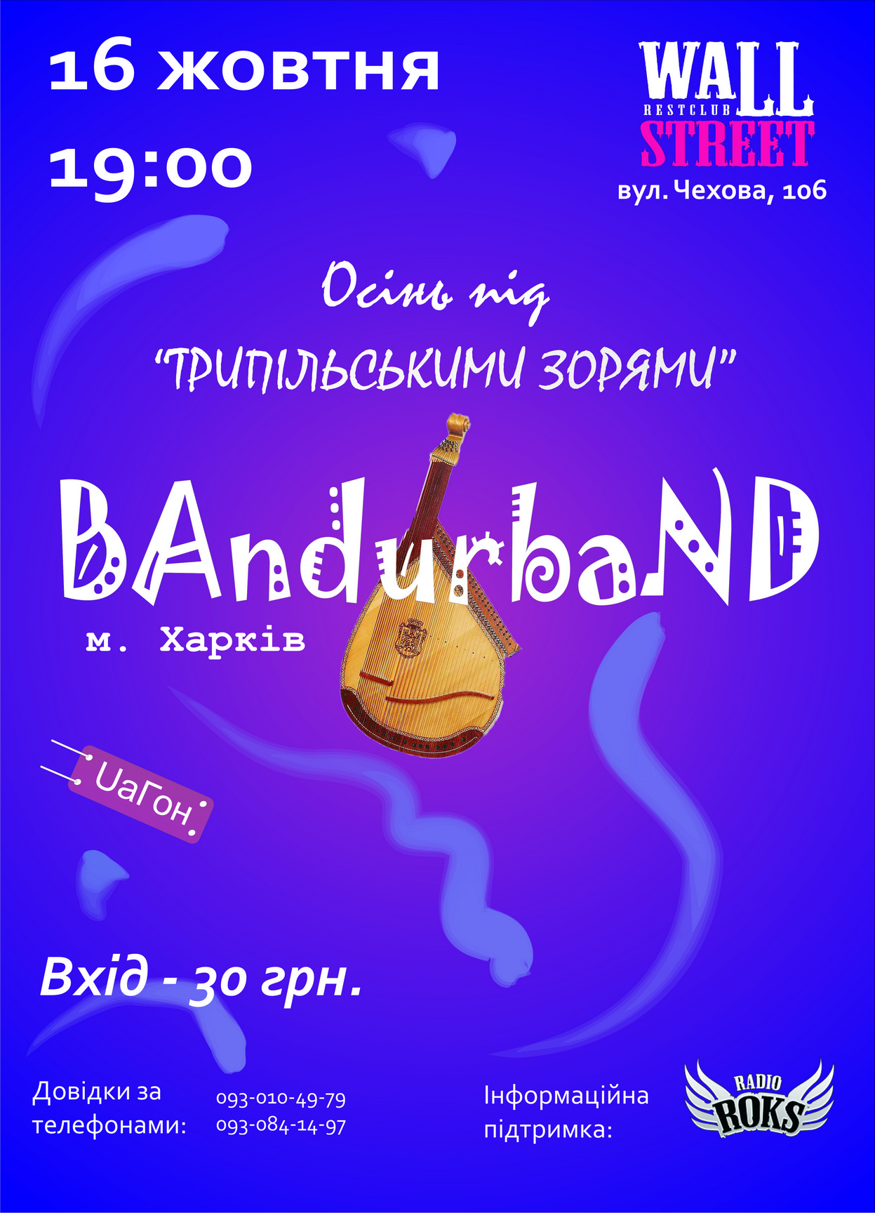 Один із найяскравіших колективів літа - гурт "BAndurbaND" (м. Харків) - та гурт "Печворк" (м. Черкаси) завітають 16 жовтня (субота) до клубу Wallstreet!