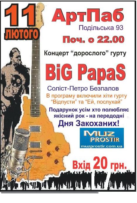 та критикують ... рок-гурт «Big Papas», у своєму складі гурту зовсім до непристойності стандартний: барабани, бас, гітара і вокал. Все просто і потужно. На сцені з’явились дорослі дядьки, які, це відчувалось, вже досить давно займаються музикою. Потужний драмер, басист і гітарист робили погоду. Вокал під стиль гурту...Щодо матеріалу і поведінки на сцені в мене немає ніяких претензій. Ну, хіба що, іноді вокаліст виглядав кумедно. Особисто мені він нагадував А.Сєрова. Але на це можна не звертати увагу, адже в цілому все було досить не погано.Загалом дуже сподобались пісні «Відпусти» та «Ей, Послухай» - потужно і досить цікаво....